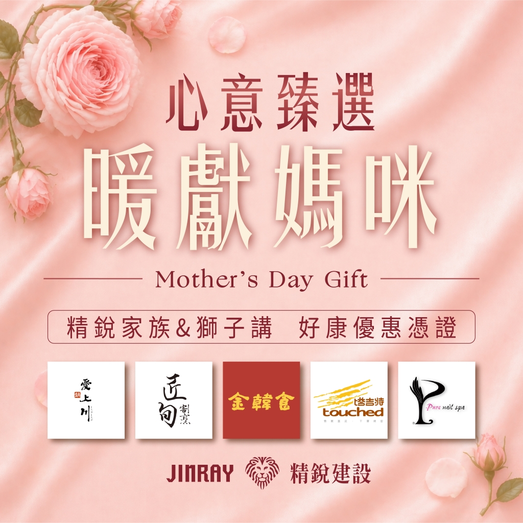 今年母親節,精銳攜手與五間特約質感店家,為獅子講粉絲們祭出早鳥母親節優惠,店家精選「金韓食」屋馬集團新韓食、「愛上川鍋物」奢華精緻質感火鍋、「匠旬割烹」高級無菜單板前料理、「Touched塔吉特千層蛋糕」網路人氣千層蛋糕和「Pure Nail SPA」專業手足保養美學,為期三週期間限定好康大放送!2026母親節檔期一起溫馨過!獻上LINE好友專屬優惠,還沒加入精銳建設官方LINE@的朋友,點我加入即享上述優惠哦~
