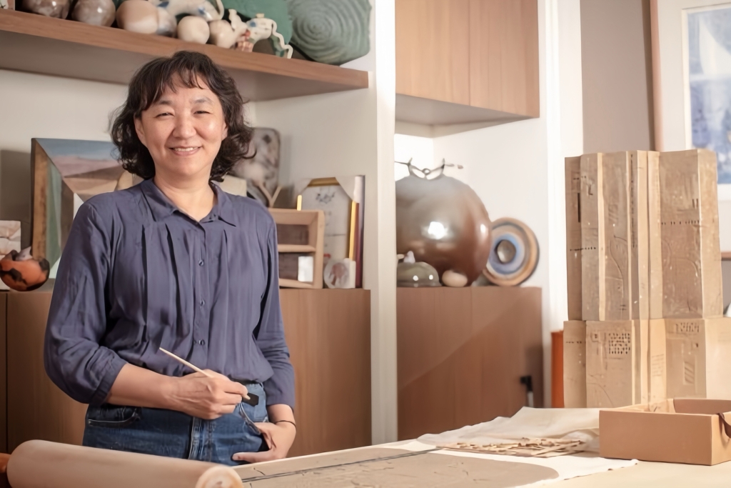 現任國立中央大學松陶社指導老師,其陶藝創作深受書法與漢字結構啟發,從「圓」字的「方」形特徵出發,延伸出象徵天地、人文與自然交融的《方圓系列》創作語彙。其後發展的《塔樓系列》,以錯落並排的陶塊建構出可親可觸的「陶都」意象,流露出都會中柔軟的詩意與情感,《空間幻想系列》以溫暖色彩構築小屋意象。